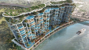 A commercial tower in Dubai Maritime City with a cascade of terraces and offset architectural levels. The project features 116 offices with a height of 3.2 meters with panoramic windows and flexible layouts. The podium features a green urban garden with lounges, fitness zone, yoga areas and cafes.