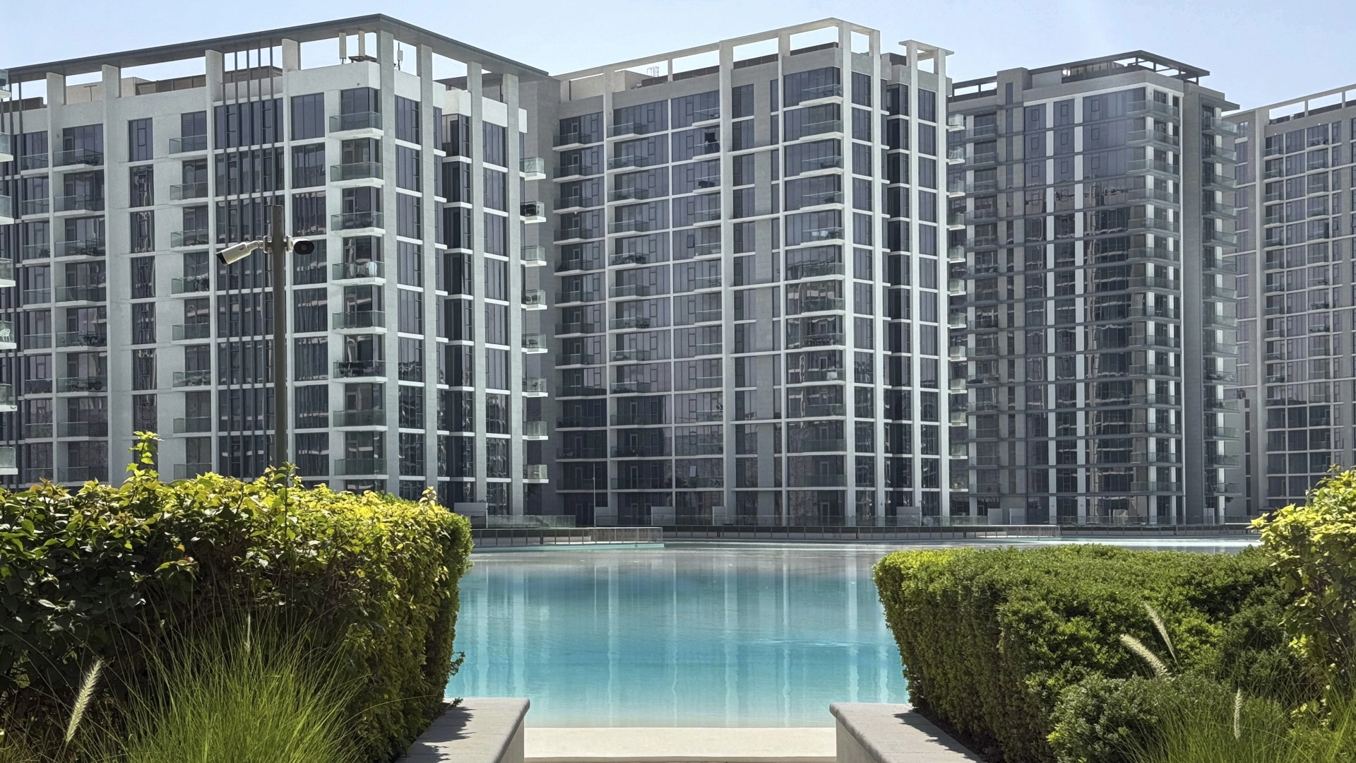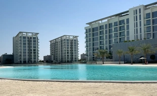 A collection of apartments in the coastal area of Yas Island in Abu Dhabi. Four buildings are united by a podium, in the center of which there is an azure pool, and around the perimeter are scattered flowering bushes and trees.