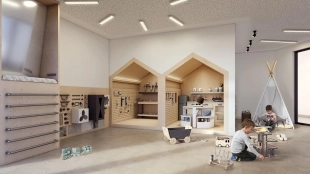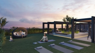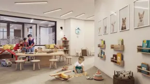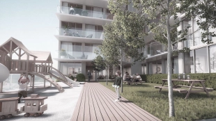 outdoor swimming pool with sunbathing terrace, women's and men's saunas, clubhouse, co-working space, children's playroom, cafes and stores, bicycle parking lot