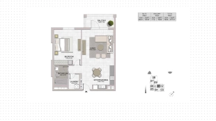 1 bedroom apartment in the La Sirene complex in the Port de la Mer residential area. The layout includes a kitchen-living room with access to a balcony, a bedroom, a bathroom and a laundry room. Panoramic windows flood the rooms with natural light.