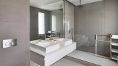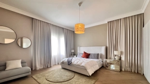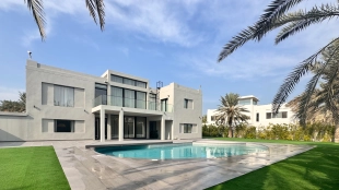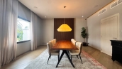 Spacious 4 bedroom villa in the prestigious Emirates Hills community. The residence is located on a 18,000 ft² plot with a large swimming pool and sun terrace. The interiors are contemporary in style with all the necessary furnishings, sanitary ware and accessories by Bagno Design. A variety of textiles and decorative elements create a cozy atmosphere. Various lighting scenarios are provided. Thanks to the panoramic windows and two-light layout, the rooms are filled with natural light.