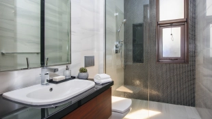 Inside there is a relaxed atmosphere thanks to the light color scheme of the finishing. Dark window frames and wood cabinets look spectacular against the milky walls. The closed plan kitchen has all the necessary furniture and appliances so you can start preparing your favorite dishes from the first days in your new home. The layout includes living room, kitchen, 5 bedrooms with bathrooms, staff room with bathroom, guest bathroom, hall and 2 balconies.