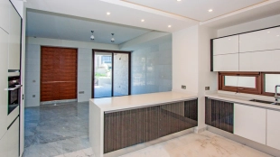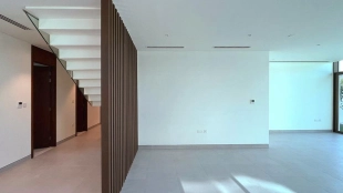 Four bedroom duplex townhouse in Souk Al Jubail Villas community. The interior is contemporary in style, combining wood and stone textures.