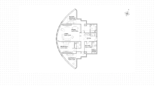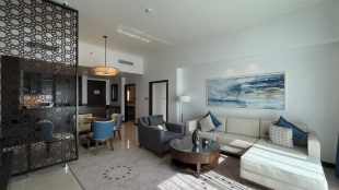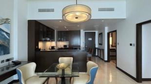 One bedroom apartment in Fairmont Marina Residences, managed by the world famous Rixos hotel chain. The layout includes a spacious living room with dining area and open plan kitchen, a bedroom with dressing area and bathroom, a pantry and a guest bathroom.